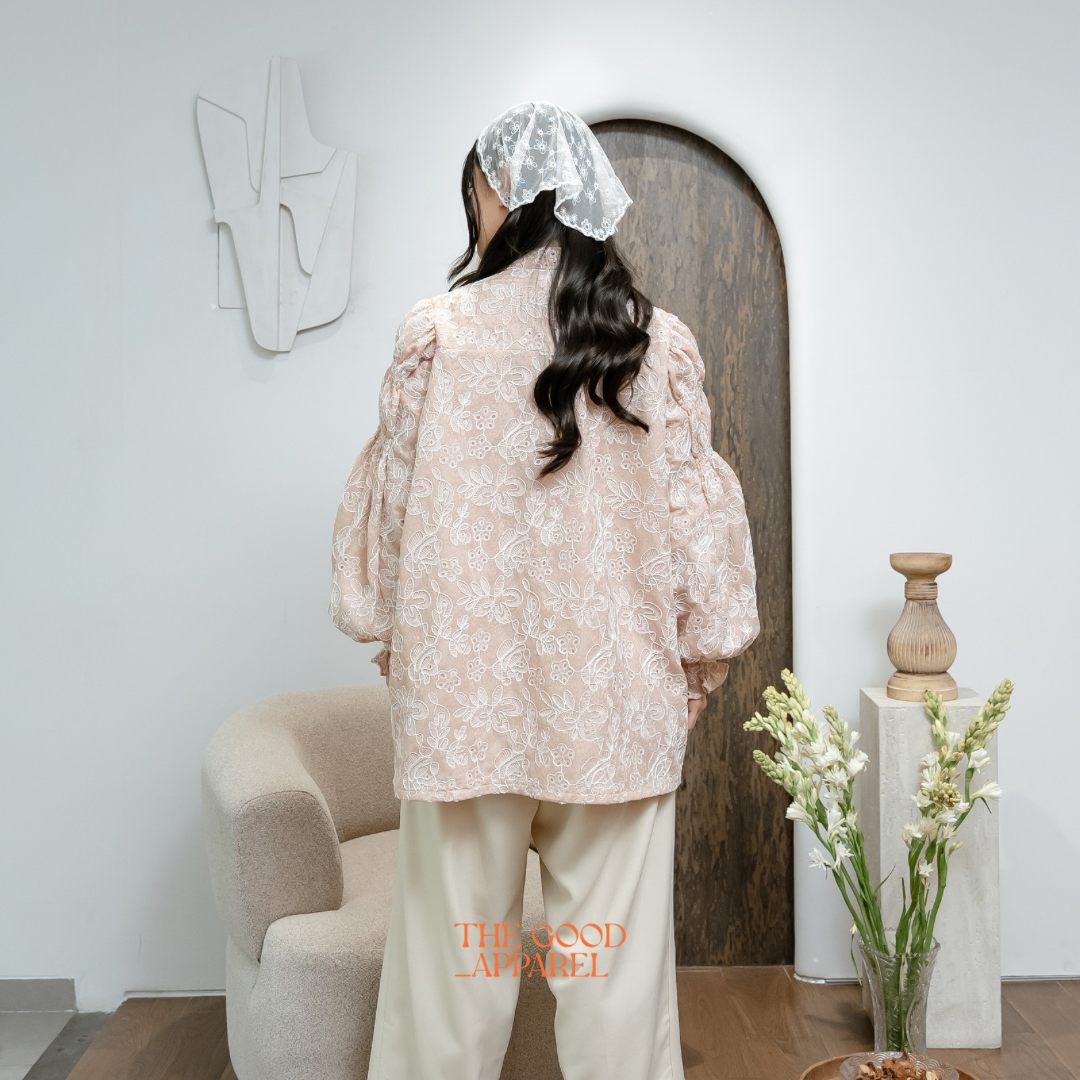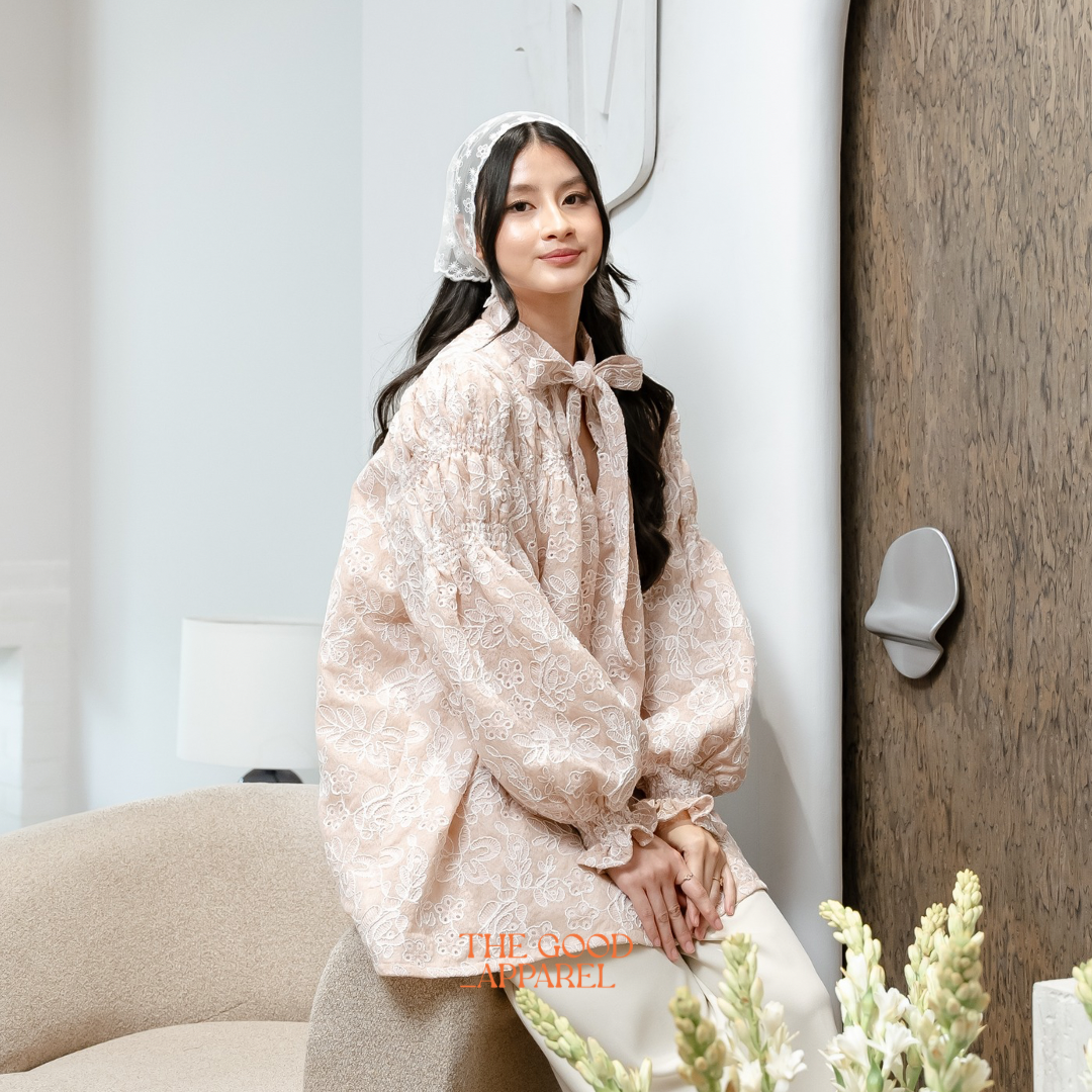 A modern blouse designed with a ribbon neckline for a youthful and refined look. The silhouette is elevated through voluminous sleeves, adding softness while maintaining a polished structure.